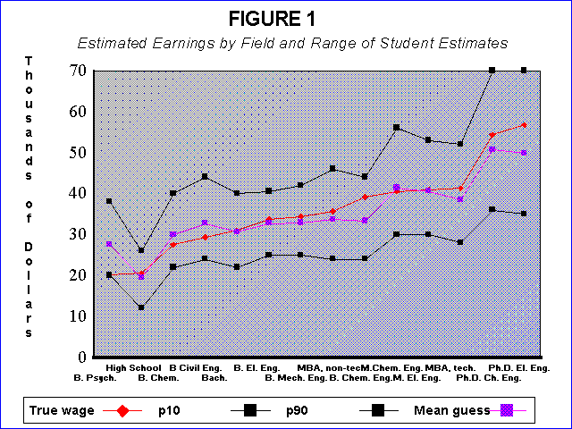 Here's one of the principal graphs from the paper, showing the distribution of estimates of starting salaries along with the 'true' values. The 'mean' student is in most cases surprisingly close to the actual salary, although the distribution of guesses is quite wide: